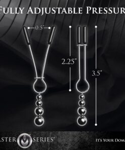 These tweezer style nipple clamps adorn the chest with three graduated silver balls that dangle from the end. The adjustable clamps have a sliding ring that will allow you to modify the amount of pressure that is applied, and are coated with vinyl for comfort and a better grip. These beaded clamps are ideal for beginner or advanced nipple play. With a little imagination, they can also be used on the scrotum, penis, labia, ears, or any part of the body you desire…
