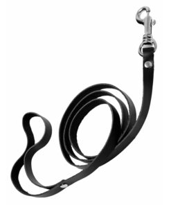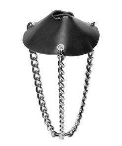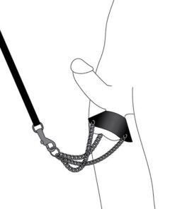 Get them by the balls and lead them to whole new levels of pleasure and power play. The leather parachute snaps around the scrotum, attached to an O-ring by 3 shining chains. The 4 foot leather leash is topped by a snap hook, so you can attach your leash to the balls of your subject, controlling their movements with every tug. The leash also has a looped leather wrist strap, so you can get a firm grip.