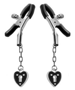 These easy to use clamps have a simple screw-down design, accented with heart shaped padlock detailing. The vinyl coated tips allow for a comfortable and secure grip while the black lacquered heart accent dangles enticingly from the end. The screws on the sides allow you to control just how much pressure your partner receives.