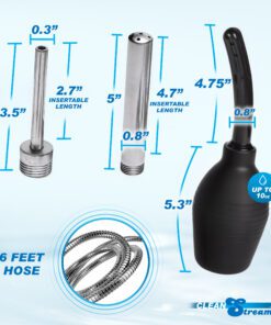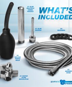 Note: Kit includes (1) hose, (2) nozzles, (1) flow regulator, (5) rubber O-ring seals, and (1) deluxe 10 oz douche or enema bulb
