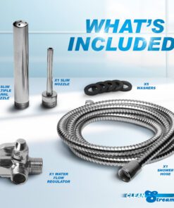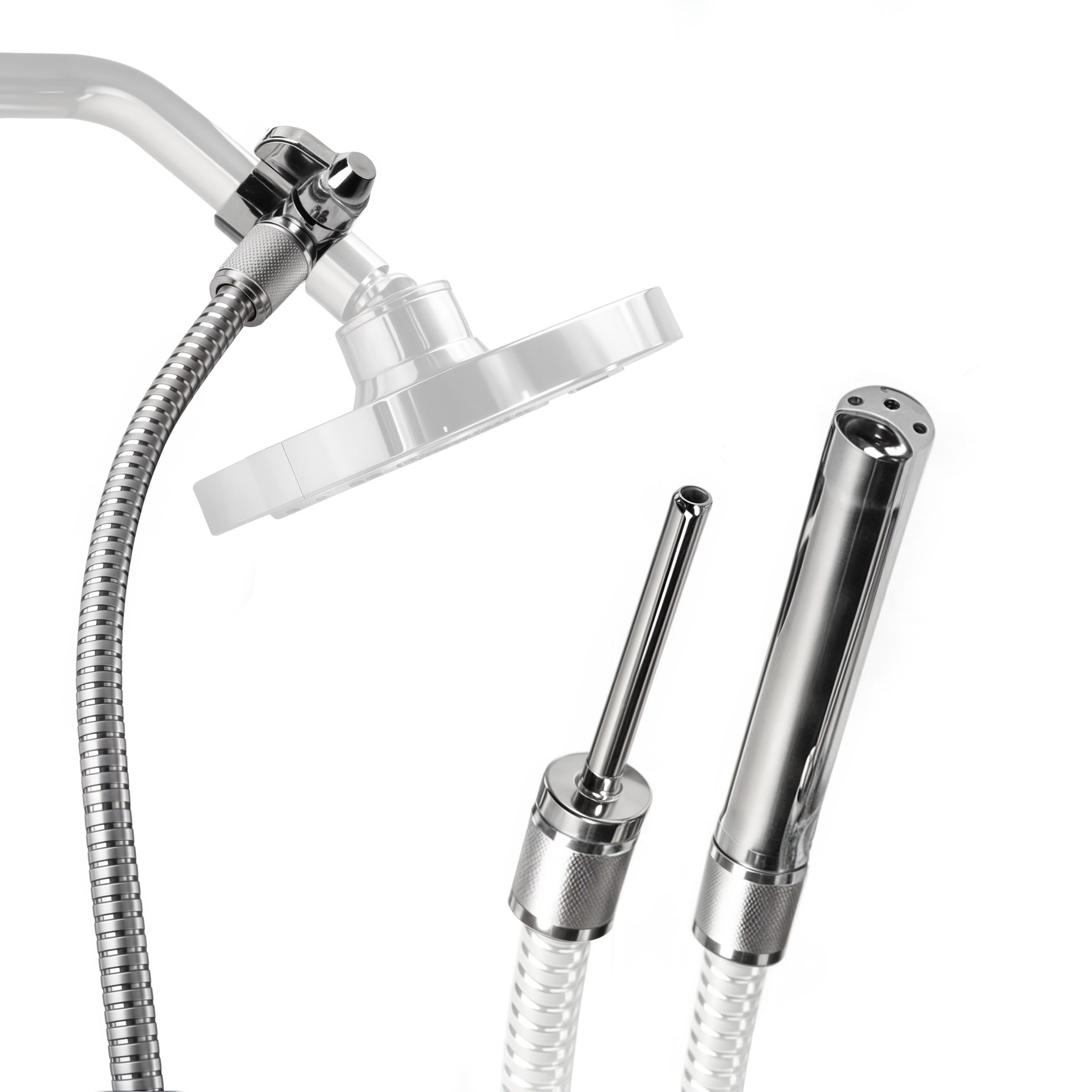 This is a very neat enema system. Its douche and enema nozzle is outfitted for use as a shower attachment. The Shower Enema Kit comes with two nozzles, one is 5 inches and the other is 3.5 inches. It also comes with a 6 foot metal hose. One end of the hose screws into your shower, the other end is where you attach your choice of nozzle. Where the Shower Enema Kit connects with your shower it has a valve that directs the water either through the nozzle and into you or to the shower head. Use the shower knob to regulate the force of water through the hose.