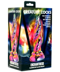 Transform your sex toy collection with phenomenal additions from Creature Cocks! This Kraken dildo has an iridescent, metallic, rainbow of colors featuring bright pink and yellow gold! It is made out of a firm, super smooth borosilicate glass. This kind of glass is the same that you often find in kitchenware and is not only durable and high quality, it also can handle temperature changes so you can enjoy warming it up or cooling it down before insertion! The tip is tapered to make insertion easier and it gradually widens towards the base. Along the shaft are spirals of octopus tentacles with small suckers that add texture to the shaft and stimulate you with each deep plunge within your watery depths! The base is flared so you can combine it with a strapon harness as long as the O-rings are soft. Make sure to use soft O-rings on the firm glass such as silicone or rubber and never use it with metal O-rings! This glass dildo is phthalate-free and body-safe to use with any lubricant type. To wash, use warm water and mild soap then rinse and spray it with a toy cleaner. It is dishwasher safe but exposure to boiling water may result in the color fading.