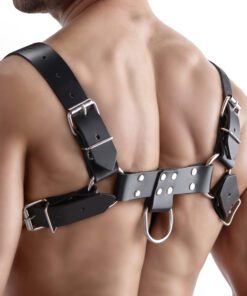 This enticing chest harness will wrap your partner in leather and metal for an exciting look and exotic feel. Featuring multiple points of adjustment, this harness is designed to adorn his chest and add to the look and feel of your next bondage scene. A D-ring at the front and back allow you to attach ropes, leashes, or restraints for more bondage possibilities. Let this sexy piece spark your imagination.