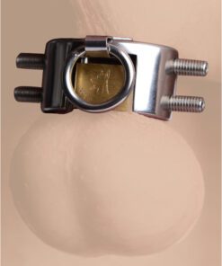 This sturdy, solid CBT device acts as a ball stretcher, scrotum torture device, and ball collar all in one! Snap this heavy metal band in place, and secure it with lock, which is built right into the cuff. There is absolutely no escape once it is locked into place. The larger size allows for ultimate restriction and security on bigger girths, or for more room if you find the smaller version too tight. Four pointed screws line the inside of this devious piece, which can be twisted to apply more pressure. The front features a steel O-ring, so you can lead your pet around with a leash, add ball weights, or lock him in place. Use alone or in conjunction with other toys, this unique CBT toy is as versatile as it is effective.
