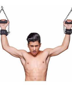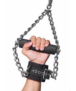 These heavy duty suspension cuffs have a built in handle, for maximum security and long term wear. The Nubuck leather has a soft appearance, with man made fur lining the cuffs adding extra comfort. The handle is crafted from wood wrapped in an easy grip foam, attached to the outer weight bearing chain. The cuffs can support up to 200 pounds of weight. Fully adjustable with metal reinforced grommets. Just attach these versatile cuffs to your own suspension bar, chain, or rope system, and leave the rest to your imagination.