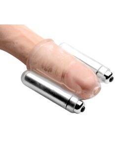 This clear sheath allows you to watch your penis head thrum! With super-powered twin vibrating bullets and a super-stretchy, head-encompassing sleeve, you can experience targeted stimulation on one of the most sensitive areas of your body! Two ultra powerful wireless bullets help surround the tip of your cock in toe-curling pleasure. Designed to fit most any size, the slick material helps keep the bullets firmly against your helmet, while transmitting the vibration to every part of your cock head. A cum-through hole allows for the ultimate orgasm. Just slip it on and go!