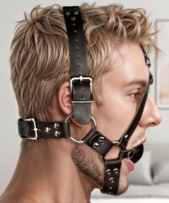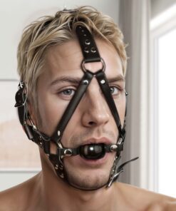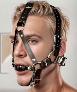 This ultra restrictive locking ball gag harness will make sure your sub will not be able to wriggle their way free. With straps running behind the head, one going under the chin, and one supporting the gag, your partner will be restrained from all angles. The straps have multiple points of adjustability to ensure a comfortable, tight fit. Made of sturdy, flexible leather and heavy duty metal hardware, this quality piece is as beautiful as it is effective.
