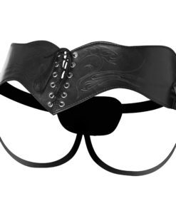 This stylish strap on harness has exquisite detailing in the back, designed to highlight your best assets as you pound your partner. The back of the harness laces up, and is adorned with curling designs stamped right into the leather. A soft, felt-like lining keeps the wearer comfortable. The nylon leg straps are fully adjustable, curving behind the thighs and under the buttocks, leaving the crotch area open. The sturdy, solid rubber O-ring snaps into place, and supports most dildos with balls or a flared base. The harness comes with 3 O-rings, which gives you a wide range of dildo options.
