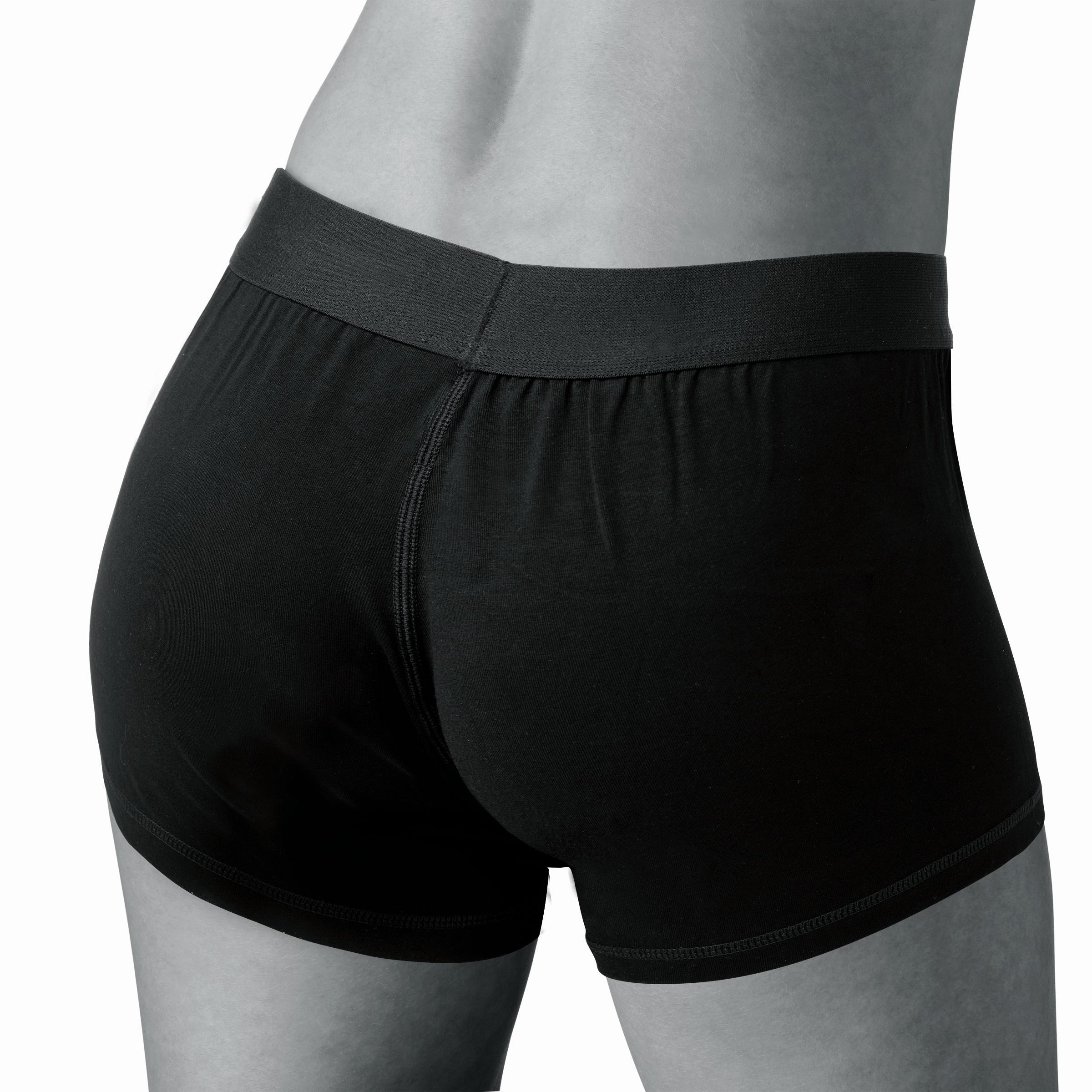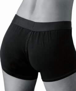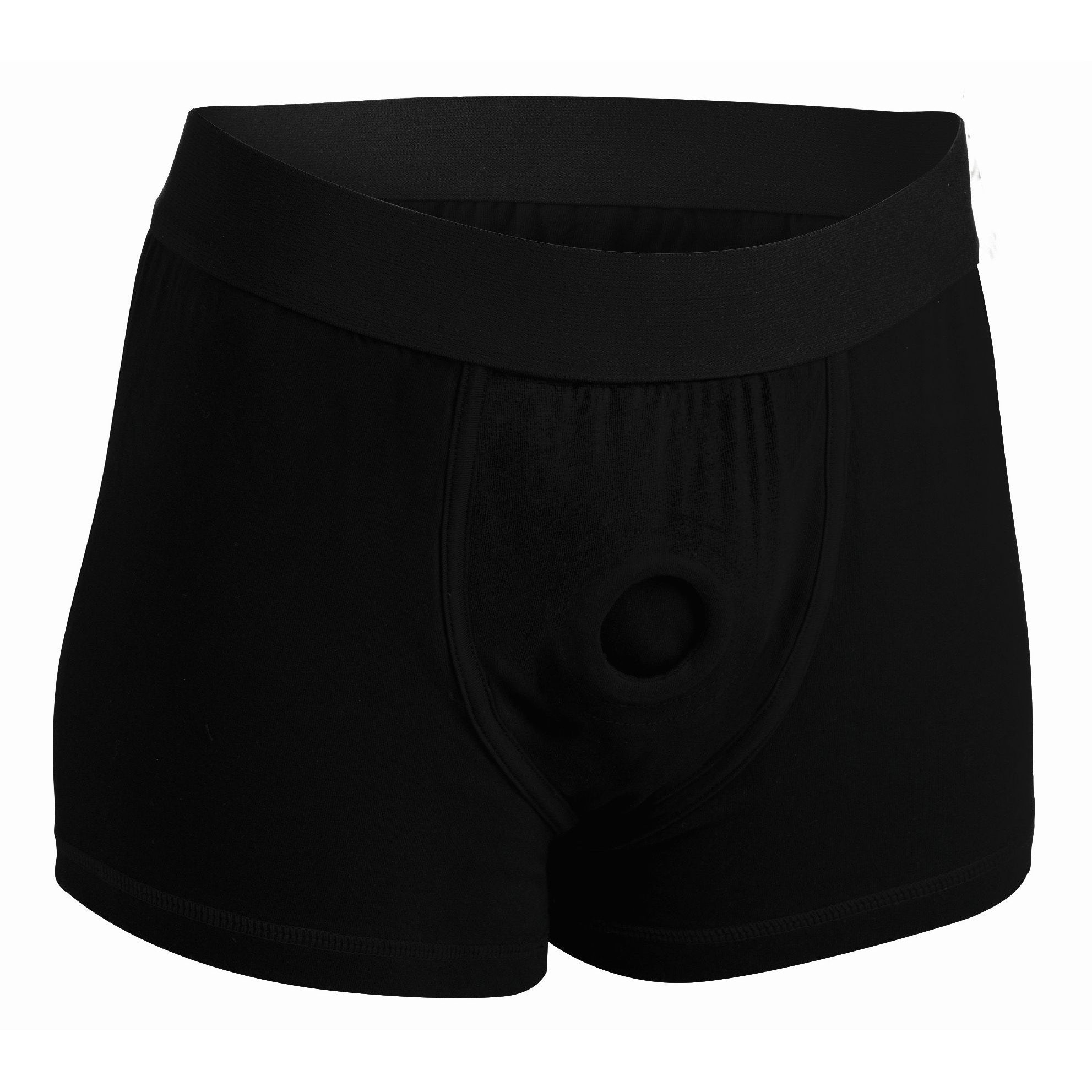 Feel more comfortable and stylish than ever before when you strap on your favorite dildo. This boxer brief style harness feels just like underwear, with an O-ring that stretches to accommodate most dildo sizes. You can even wear these cotton shorts out under your clothing, or stuff them with your favorite packer. This harness is excellent for extended wear. The supportive elastic waistband will carry the weight of your dong and you will be allowed greater mobility and position versatility. This harness is recommended for use with dildos that have a flat base that is 1.75 inches or wider. Machine washable.