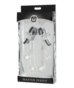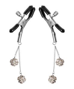 This sparkling set of rhinestone adorned nipple clamps will give you a dazzling way to make sure their eyes stay on you! The cube shaped embellishments are set on all sides with clear sparkling gems which catch the light with every movement. The clamps themselves are vinyl coated, with a thumb screw that allows you to adjust the tightness as you need it. The adjustable pressure make them ideal for all experience levels.