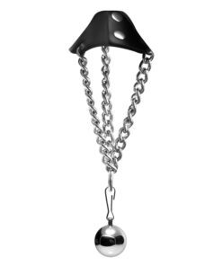 Enjoy the unique sensation of someone tugging on your balls with this effective ball weight set. The leather parachute provides even, consistent pressure all the way around. It has snaps so you can adjust the tightness. 3 chains hang from the bottom, coming together at a metal ring. You can attach your weights to this ring. The weight is 8 ounces.
