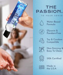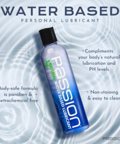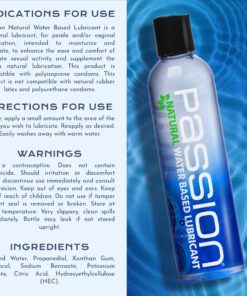 Get nice and wet for some steamy action with Passion Natural Water-Based Lubricant. With its superb formula you will have a natural feel that keeps you moist longer for those extended wild bedroom sessions. This lube also works great with all toy materials for your private sessions. Comes in an easy to use spill proof bottle perfect for those who enjoy adventures on the go, so lube up and get ready for Passion! Passion is petrochemical-free, glycerin-free and paraben-free. Washes easily with soap and water