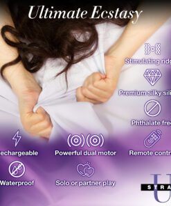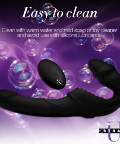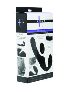 With a push of the button on the remote control, send vibration into the slender shaft and the textured bulb of this double-sided dildo. This rechargeable pleasure tool features dual motors to provide you with 3 speeds and 6 patterns of powerful internal thrumming for both partners. The single control button on the Pro Rider is easy-to-use and accessible during penetration, but a remote control makes it even more convenient and exciting! The silicone remote fits easily and securely in your hand while you immerse yourself in intimacy, granting access to all 9 functions. Both ends of this artfully designed double dong are shaped for the ultimate in ecstasy: the bulb is adorned with gentle waves while you grind your clit against bold grooves of the front pad. Meanwhile your partner will be treated to a narrow, comfortable shaft with a slight ridge. It is even waterproof so that you can take your play into the shower, bath, pool, and more! Explore greater intimacy with a vibrating double-ended strapon dildo. Made of silky silicone, the Slim Rider is non-porous and phthalate-free. Clean with warm water and mild soap or toy cleaner and avoid use with silicone lubricants.