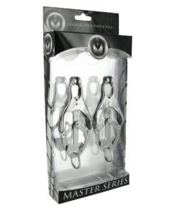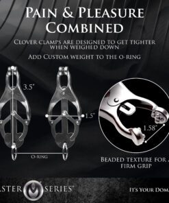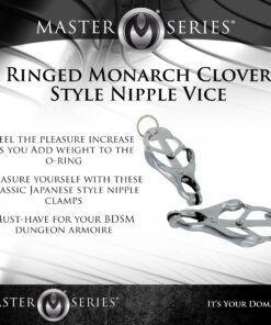 A comely device of restriction and paradise. The Ringed Monarch is an effective training tool in the art of endurance and sensation play. These devious chrome clover-style clamps are ideal for solo play or with the one you want to dominate. When the O-ring is pulled, the clamps pressure becomes more intense. Use your imagination, this devious set includes a convenient O-ring that can be weighted, laced, and more. In your domain: you decide.
