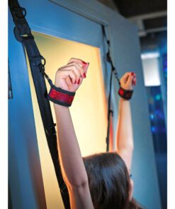 This set of over the door restraints are cross-shaped, to hold both their wrists and ankles. Fully adjustable to fit standard and oversized doors, it has sturdy straps and bar hooks for secure placement. Both the wrist and ankle cuffs are fully adjustable, and detach easily. Lined with soft plushy fabric, with designer fabric on the outside. Folds up small, so you can take it with you wherever you go.
