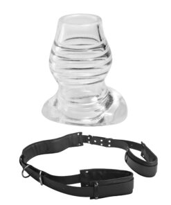 Keep them spread open wide with this ultimate inner access system! The adjustable body harness will keep their legs spread, comfortably wrapping around the neck and pulling their knees back. The hollow plug will spread their ass open a full inch and a half, leaving their innermost areas exposed and at your mercy. Use the tunnel to insert anything that will fit. You are only limited by your filthy imagination.