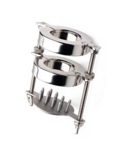 This CBT tool will make you wonder what the heck you were thinking! The weight alone will test your endurance, pulling down on your scrotum with over a pound of metal. Experience the painful pleasure on your own or with a partner, using the allen wrench to open and close the rings. Customize the experience by adjusting the nuts and fasteners to control the positioning of the rings on the shanks. Finally, this wicked device introduces another element of agony: wing nuts control a plate of sharp nails that can be raised to prick at those desperate balls! Each of the 19 points will deliver delicious agony while the stretcher and gravity do their work!