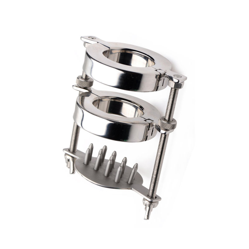 This CBT tool will make you wonder what the heck you were thinking! The weight alone will test your endurance, pulling down on your scrotum with over a pound of metal. Experience the painful pleasure on your own or with a partner, using the allen wrench to open and close the rings. Customize the experience by adjusting the nuts and fasteners to control the positioning of the rings on the shanks. Finally, this wicked device introduces another element of agony: wing nuts control a plate of sharp nails that can be raised to prick at those desperate balls! Each of the 19 points will deliver delicious agony while the stretcher and gravity do their work!