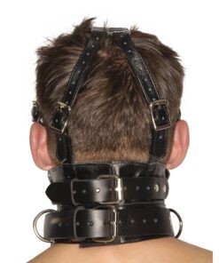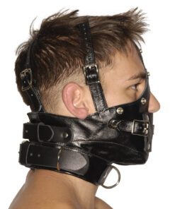 Note: Features eight buckle closures including two removable buckles for the gag. Collar features three D-rings. Includes snap-on blindfold, plain gag, and penis-shaped gag attachments.