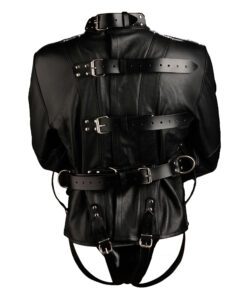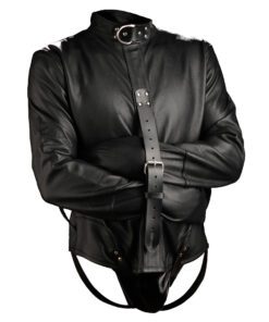 Strap down your partner and be in total control! The straight jacket keeps your partner restrained with belt style straps which are strategically located- one at the neck, three that run across the back and two around the thighs. Jacket also has three D-rings, one at the neck and one on each sleeve, for additional bondage positions. On top of all the great security, we have made the elbows more durable by applying extra leather to help prevent wear and tear.