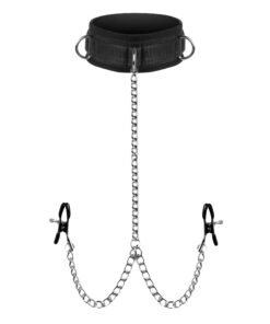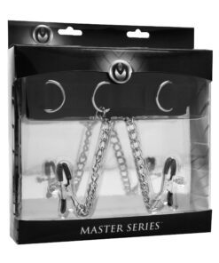 Imagine the seductive combination of collar and clamp, pleasure and pressure. Master Series has your fix with Submission Collar and Clamp Union. This two in one set is made with submission in mind. The quality collar is made more comfortable with the addition of a neoprene inner lining, and secures by means of a double Velcro binding. The collar has two extra D rings, if you want to add weights, rope, or any other accessory you can imagine. This duo features a 14 inch chain that splits in two at 8 inches, attaching to the collar at a front D ring. Each chain ends at an adjustable alligator style nipple clamp, easily made tighter with thumb screws. Each clamp has a vinyl tip for added comfort and better grip. Adorn the neck of your naughty one with this striking collar, as the chain dangles seductively against their chest.