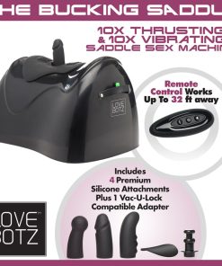 When you crave non-stop satisfaction, your ride awaits! This Saddle Sex Machine is lightweight and has handles on either end of it so you can grab the straps and move it easily. Inside this machine lies hours and hours of intense, powerful pleasure! With four attachments that you can easily swap out with each other or your own personal favorite toy using the Vac-U-Lock Adapter, you’ll never grow bored! Grind against the non-penetrating, smooth, clitoral attachment. Enjoy the realistic, phallic attachment, the ribbed, G-spot/P-spot targeting attachment, or the round attachment if you want penetrative pleasure! With each of the attachments, you can count on non-stop power as the machine itself is plugged into a wall outlet. Control the vibrating and thrusting settings using the battery operated remote from up to 32 feet away! Either you or your partner can be in control! Choose between 3 speeds and 7 patterns of vibration and 10 speeds of thrusting! Ride this sex machine into orgasmic oblivion and then tuck it away into a closet for discreet storage. After use, wash the premium silicone attachments with warm water and mild soap after detaching them from the machine, then spray them and the machine with toy cleaner before wiping them dry. Use only with water-based lubricants.